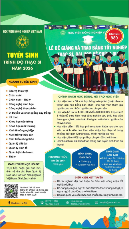 Học viện Nông nghiệp Việt Nam thông báo tuyển sinh trình độ thạc sĩ năm 2026 với 16 ngành, đáp ứng nhu cầu nâng cao trình độ chuyên môn, năng lực nghiên cứu và quản lý cho đội ngũ cán bộ, kỹ sư, cử nhân trong cả nước.